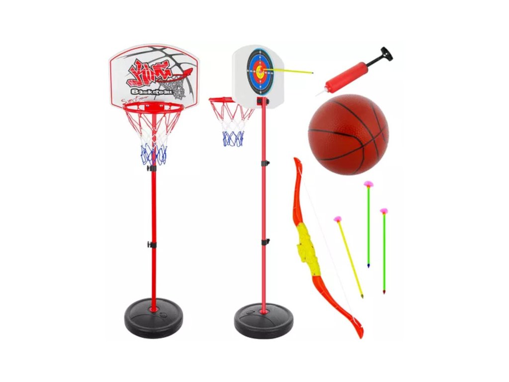 Basketbalový kôš so stojanom, ktorý je súčasťou sady spolu so streleckým terčom, lukom a šípmi a má nastaviteľnú výšku od 73 do 146 cm, predstavuje kompletnú sadu na zábavné outdoorové aktivity a tréning.