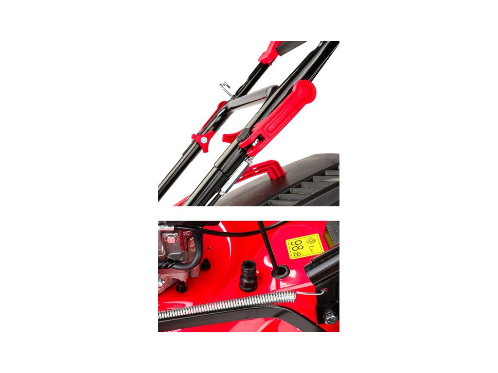 - Ergonomická rukoväť: centrálna rukoväť bola navrhnutá pre maximálne pohodlie používateľa. Vďaka ergonomickému dizajnu sa kosačka rovnomerne zdvíha a eliminuje zbytočné nakláňanie dopredu alebo dozadu.