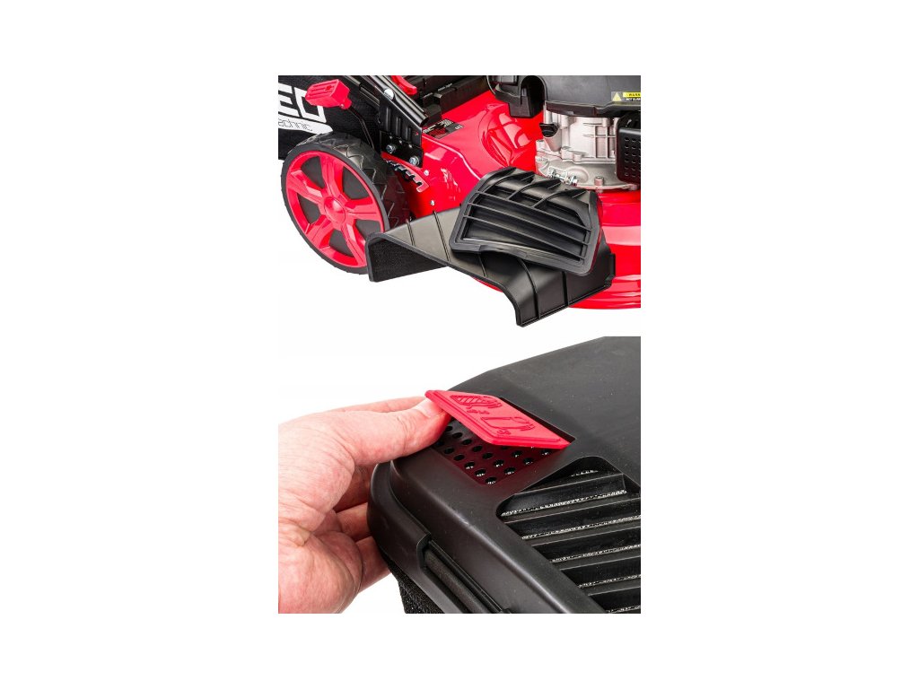 - Vystužené telo: Silné steny skrine s výstužou zaručujú výnimočnú trvanlivosť a odolnosť voči mechanickému poškodeniu, napríklad pri nárazoch kameňa. Vďaka tomu si kosačka dlho udržiava vynikajúci stav.