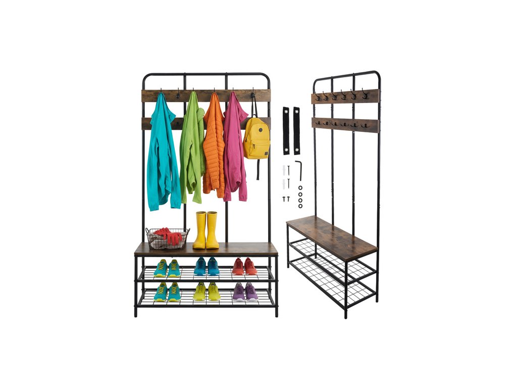 Botník s vešiakmi je praktický a štýlový organizér do chodby, ktorý kombinuje vešiak na oblečenie, botník a sedaciu lavicu v jednom. Konštrukcia v modernom loftovom štýle spája pevný kovový rám s doskami z MDF v dekore dreva, čo vytvára elegantný a zároveň funkčný kus nábytku. Organizér ponúka dostatok priestoru pre bundy, kabáty, tašky aj obuv, vďaka čomu pomáha udržať poriadok v predsieni alebo vstupnej hale. Stabilná konštrukcia z práškovo lakovanej ocele zabezpečuje dlhú životnosť a vysokú nosnosť.