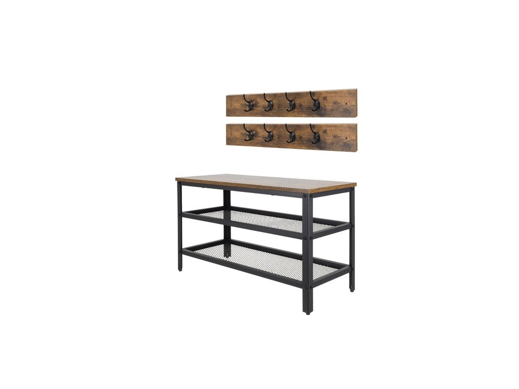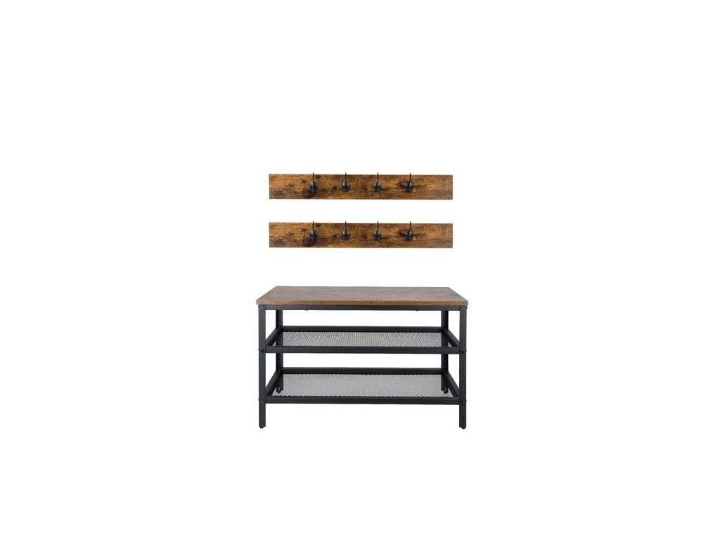 Praktický botník spája botník, lavicu s podsedákom a vešiak na oblečenie do jedného kompaktného riešenia. Pomáha udržať poriadok v predsieni, šetrí miesto a zároveň pôsobí štýlovo. Dve sieťované police pojmú niekoľko párov topánok, zatiaľ čo hnedá MDF doska dodáva interiéru teplo a loftový charakter. Robustná oceľová konštrukcia zaisťuje stabilitu a dlhú životnosť, rýchla montáž umožní použitie počas niekoľkých minút.