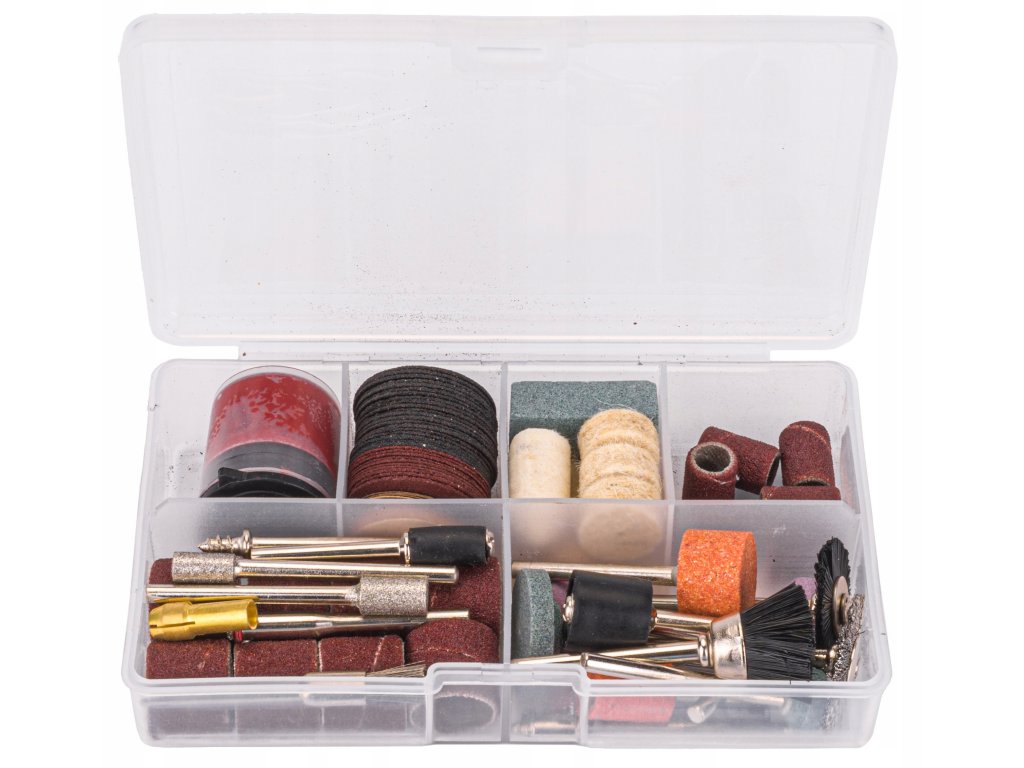 - Široká škála príslušenstva: sada obsahuje rôzne typy príslušenstva na rôzne úlohy, ako sú rezacie kotúče, brúsne papiere, škrabky a ďalšie.