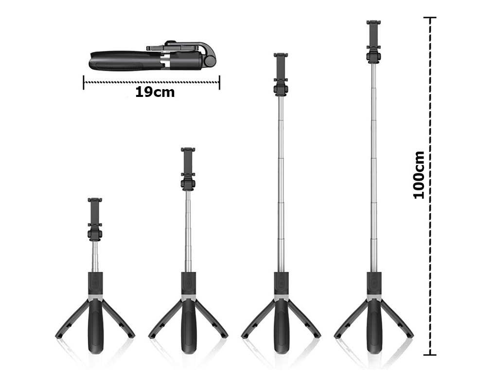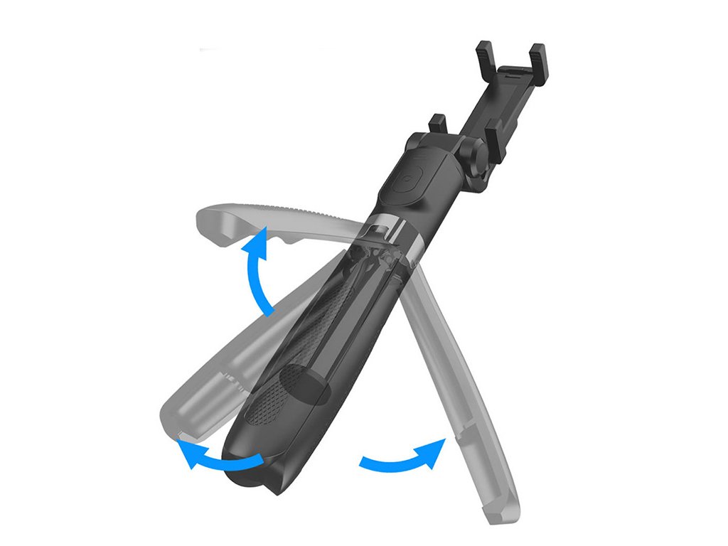 Zariadenie kombinuje klasickú selfie tyč s praktickým statívom, ktorý má tri skladacie nožičky pre stabilné umiestnenie. Bluetooth ovládač umožňuje fotografovanie na diaľku a je ideálny na cestovanie – je skladný, ľahký a vždy po ruke.
