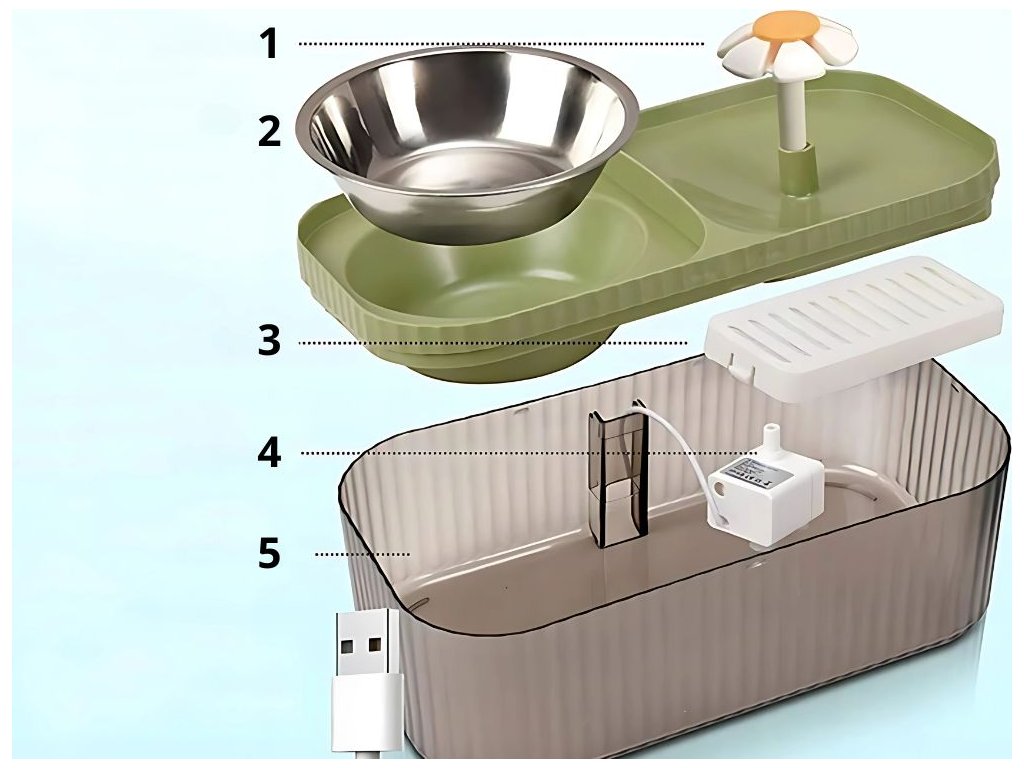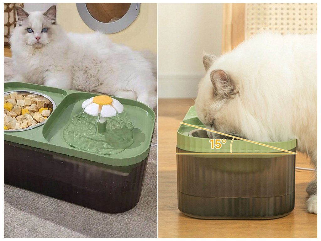 - Kompaktný dizajn: kombinuje fontánu a misku na krmivo, čím šetrí miesto.