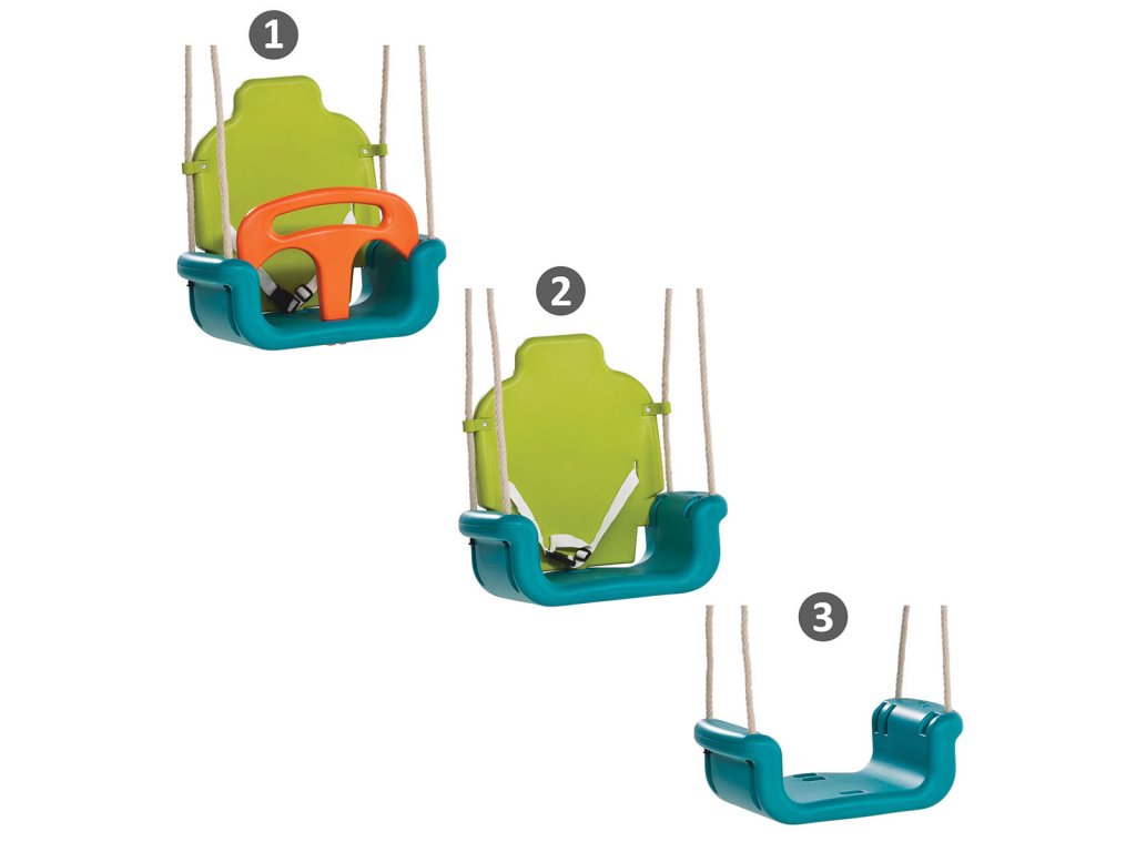 Závesná hojdačka, ktorá rastie spolu s dieťaťom! Vyrobená z odolného, stálofarebného plastu, s nastaviteľnou dĺžkou lán. Syntetické laná vyrobené z neprerušovanej priadze - polypropylénovej pásky, vyznačujú sa dobrou pevnosťou a odolnosťou. Pre bezpečnosť tých najmenších detí je hojdačka s hlbokým sedákom vybavená vysokou opierkou chrbta a prepážkou v tvare "T", ktorá je medzi nožičkami dieťaťa a zabraňuje jeho vypadnutiu. Vďaka systému "odstrojovania" až do klasického hojdacieho sedáka je možné hojdačku používať až do cca 12 rokov veku dieťaťa.