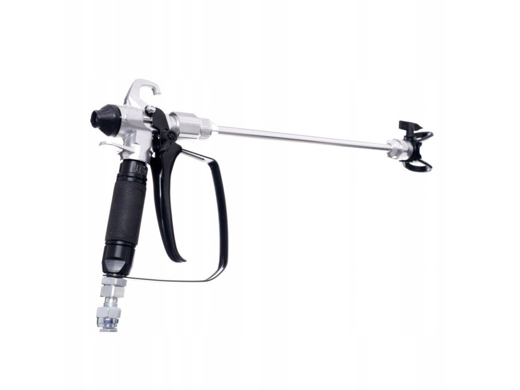 - Kovová striekacia pištoľ: Ergonomický dizajn znižuje záťaž pri dlhšej práci. Pištoľ je vybavená nainštalovaným hrotom 517 čo umožňuje presné nanášanie farby.
