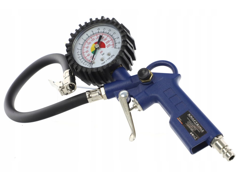 Pištoľ na hustenie pneumatík s manometrom KD427 od značky KRAFT&DELE je praktické a presné náradie na údržbu a kontrolu tlaku v pneumatikách.