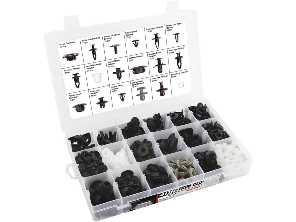 Praktická a univerzálna sada spôn, klipov, kolíkov a úchytiek obsahuje 408 kusov v 18 najobľúbenejších veľkostiach. Je ideálna na opravy a údržbu interiéru aj exteriéru vozidiel – od upevnenia panelov a čalúnenia až po montáž krytov a podbehov. Vďaka prehľadnému plastovému kufríku s priehradkami budete mať všetky diely vždy po ruke a prehľadne usporiadané.