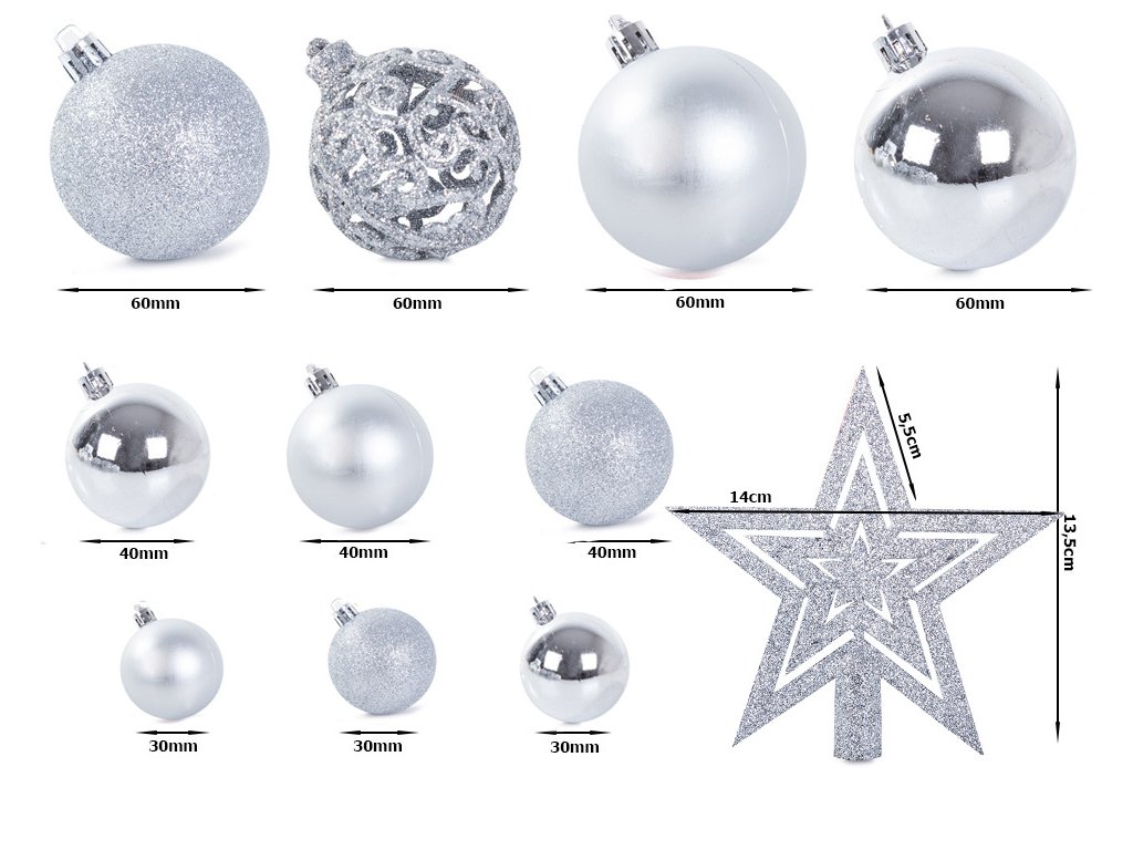 Sada vianočných ozdôb obsahuje 100 kusov dekorácií v elegantnej striebornej farbe, ktoré vytvoria na vašom vianočnom stromčeku dokonalú sviatočnú atmosféru. Rôzne veľkosti a povrchové úpravy (lesklé, matné, trblietavé aj prelamované) umožňujú vytvárať efektné a harmonické kompozície. Súčasťou balenia je aj betlehemská hviezda, ktorá ozdobí vrchol stromčeka.