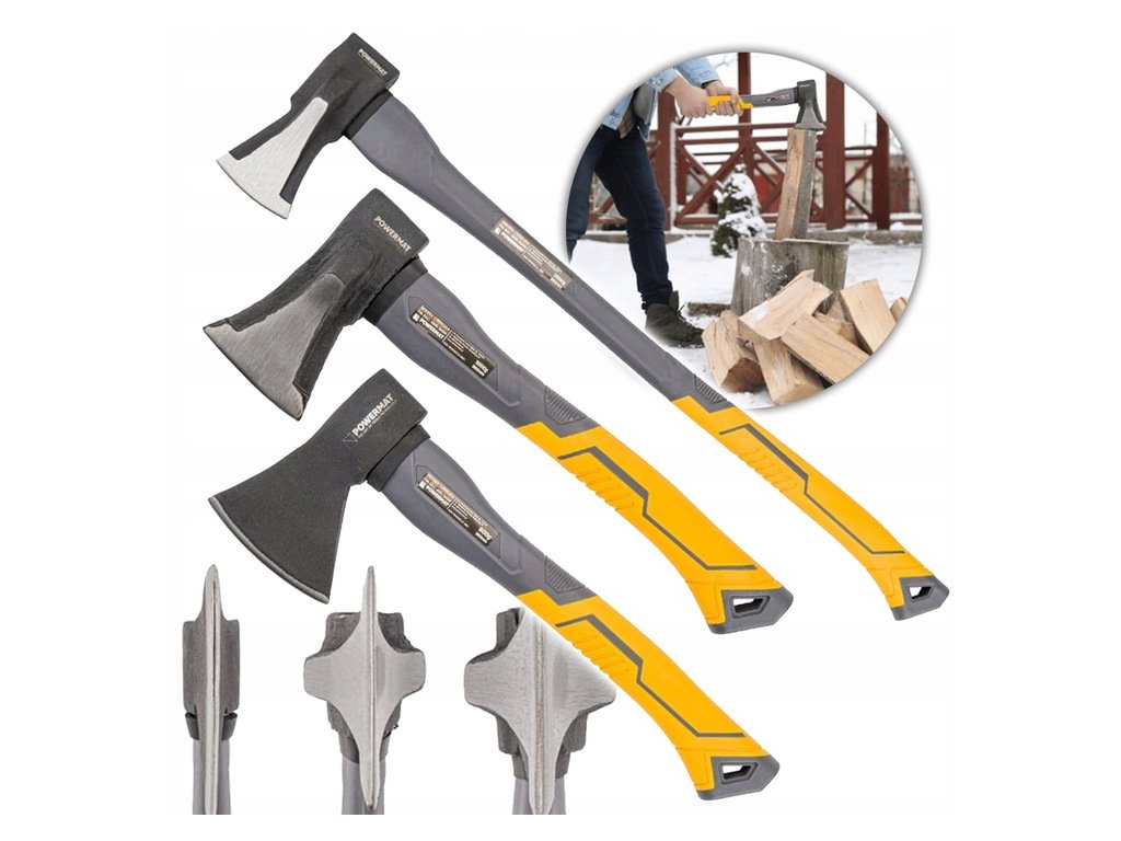 Súprava štiepacích sekier POWERMAT PM-SKC-Z3M obsahuje tri rôzne veľkosti sekier, ktoré sú vhodné pre širokú škálu prác, od štiepania palivového dreva až po jemnejšie tesárske úpravy.