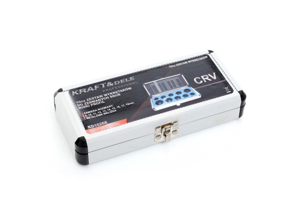 Súprava hlavíc na poškodené skrutky od značky KRAFT&DELE je praktickým a neoceniteľným nástrojom na odstránenie skrutiek a matíc, ktoré sú zhrdzavené, poškodené alebo inak znehodnotené a nie je možné ich štandardne povoliť. Táto súprava obsahuje 10 špeciálnych nástrčných hlavíc, ktoré sú navrhnuté tak, aby maximálne držali poškodené skrutky a uľahčili ich bezpečné a efektívne odstránenie.