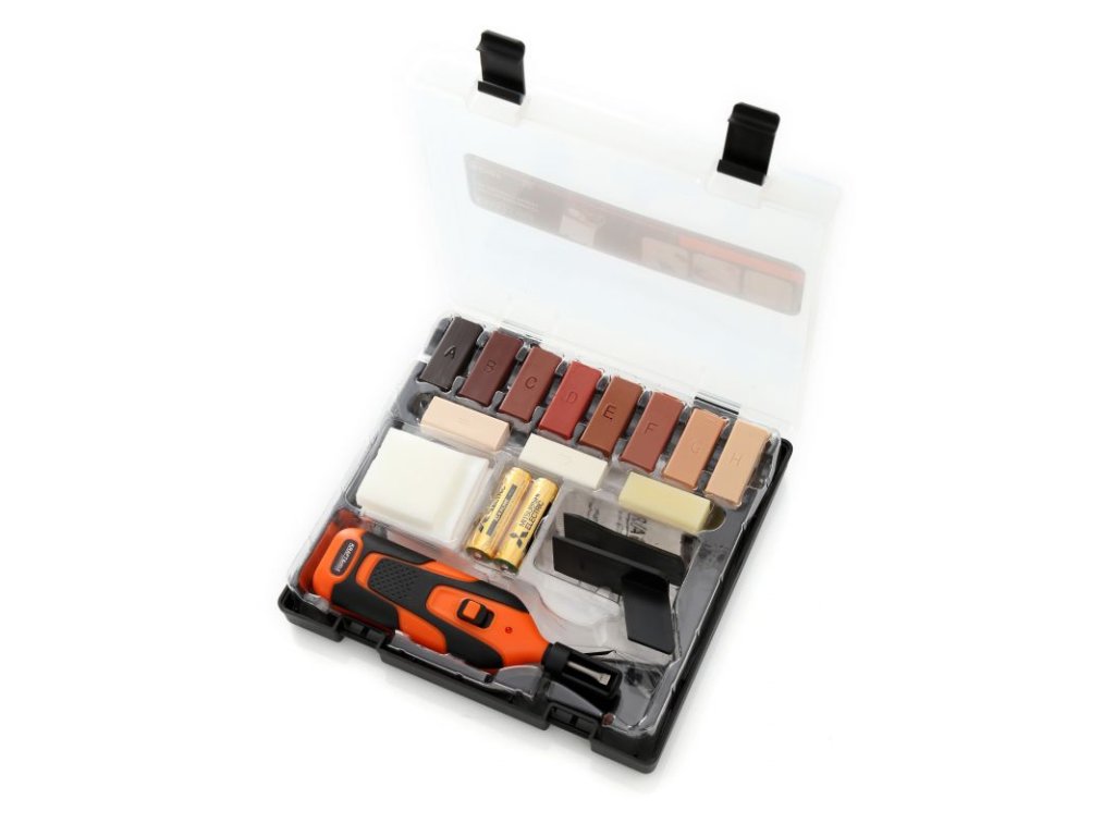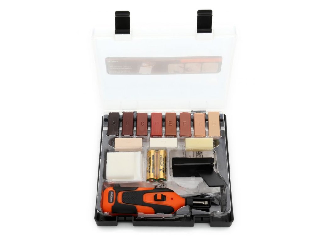 Súprava na opravu dreva KD981 na jednoduchú opravu parkiet a laminátu, korku, dreva a plastových povrchov roztavením vhodného vosku. Celá súprava je uložená v pevnom a praktickom kufríku na jednoduché prenášanie a skladovanie.
