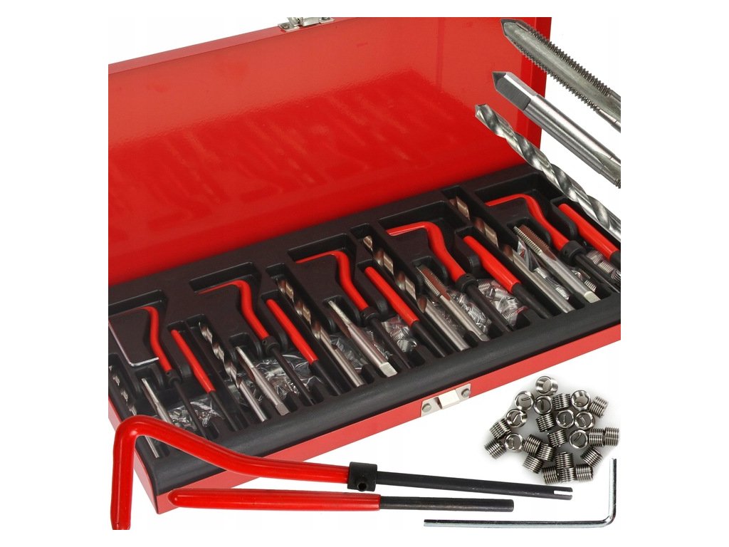 Súprava na opravu závitov sa používa na opravu akéhokoľvek typu závitového spojenia na väčšine materiálov. Vďaka veľkému počtu prvkov je sada veľmi univerzálna. Všetky nástroje sú vyrobené z najkvalitnejších materiálov - vysokokvalitnej ocele HSS. To zaručuje dlhú životnosť v dielni. Všetko je zabalené v pevnom kovovom kufríku s označenými miestami pre jednotlivé nástroje, aby sa zabezpečil poriadok.