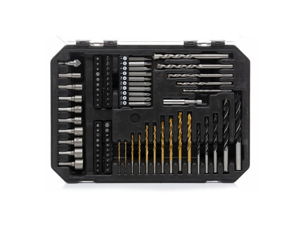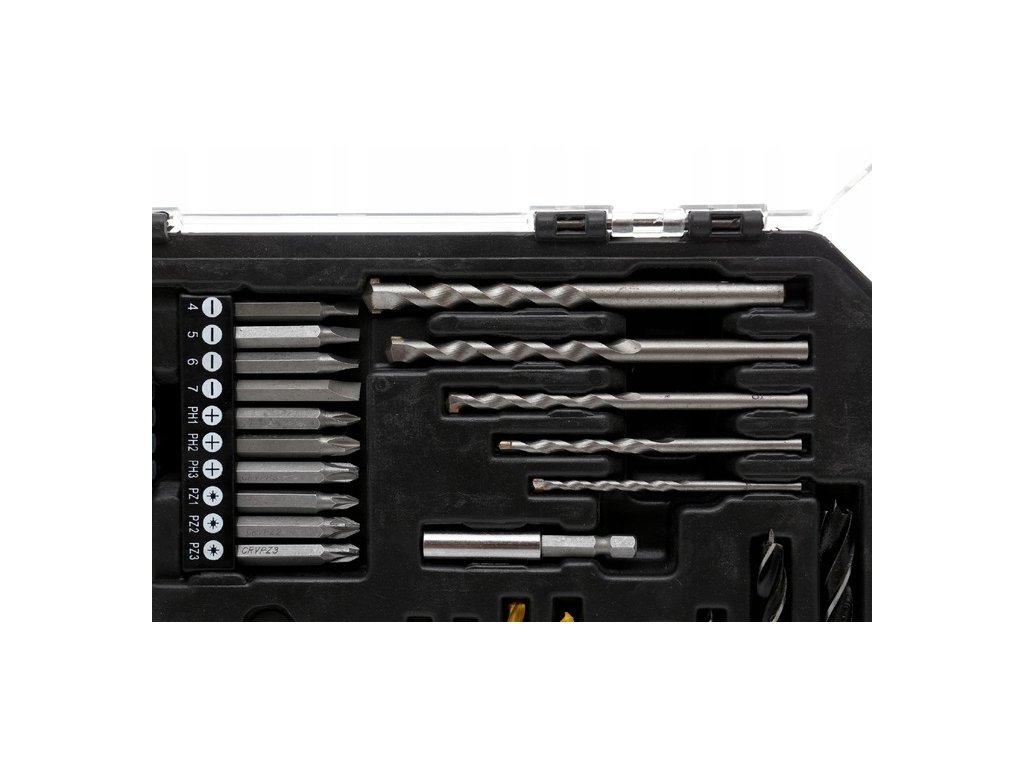 Sada obsahuje šesťhranné nástrčné hlavice s veľkosťou 5-13 mm, ako aj kompletnú sadu bitov vrátane plochých, Phillips PH, PZ, štvorhranných, šesťhranných a torx.