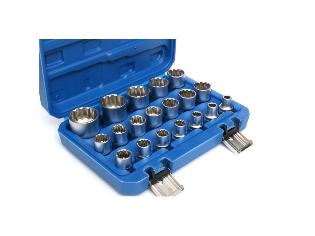 - Široká škála veľkostí: sada obsahuje 19 nástrčných hlavíc rôznych veľkostí, ktoré umožňujú použitie pre širokú škálu skrutiek a matíc TORX. Poskytuje kompletné riešenie pre prácu so spojovacími materiálmi TORX, čím sa eliminuje potreba ďalších nástrojov.