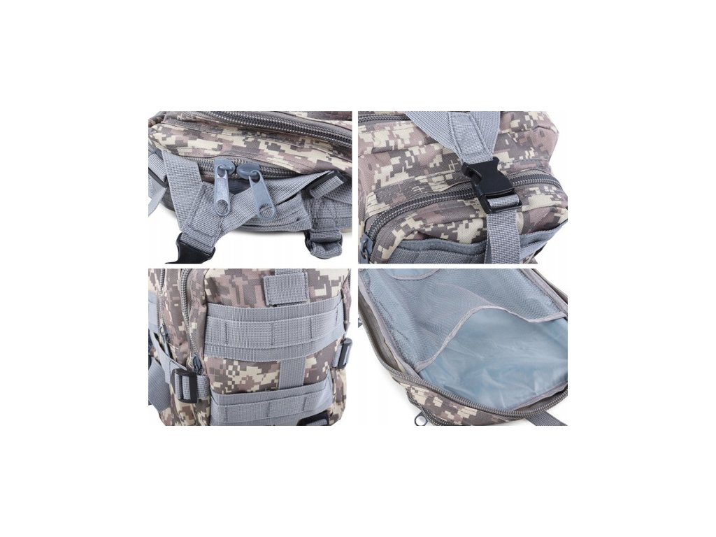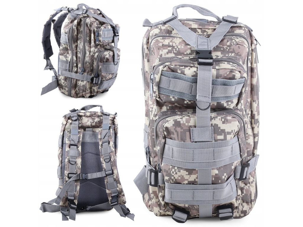 Batoh Military 30L je ideálnym spoločníkom pre nadšencov lezenia, vojenských aktivít a extrémnych športov. Vďaka svojmu všestrannému dizajnu a mnohým praktickým funkciám je ideálnou voľbou pre každého, kto trávi svoj čas aktívne, a vy budete pripravení na každú výzvu. Jeho pevná konštrukcia a dômyselné usporiadanie vreciek zaručujú, že všetko potrebné budete mať vždy po ruke. Užívajte si slobodu a bezpečnosť na svojich dobrodružstvách!
