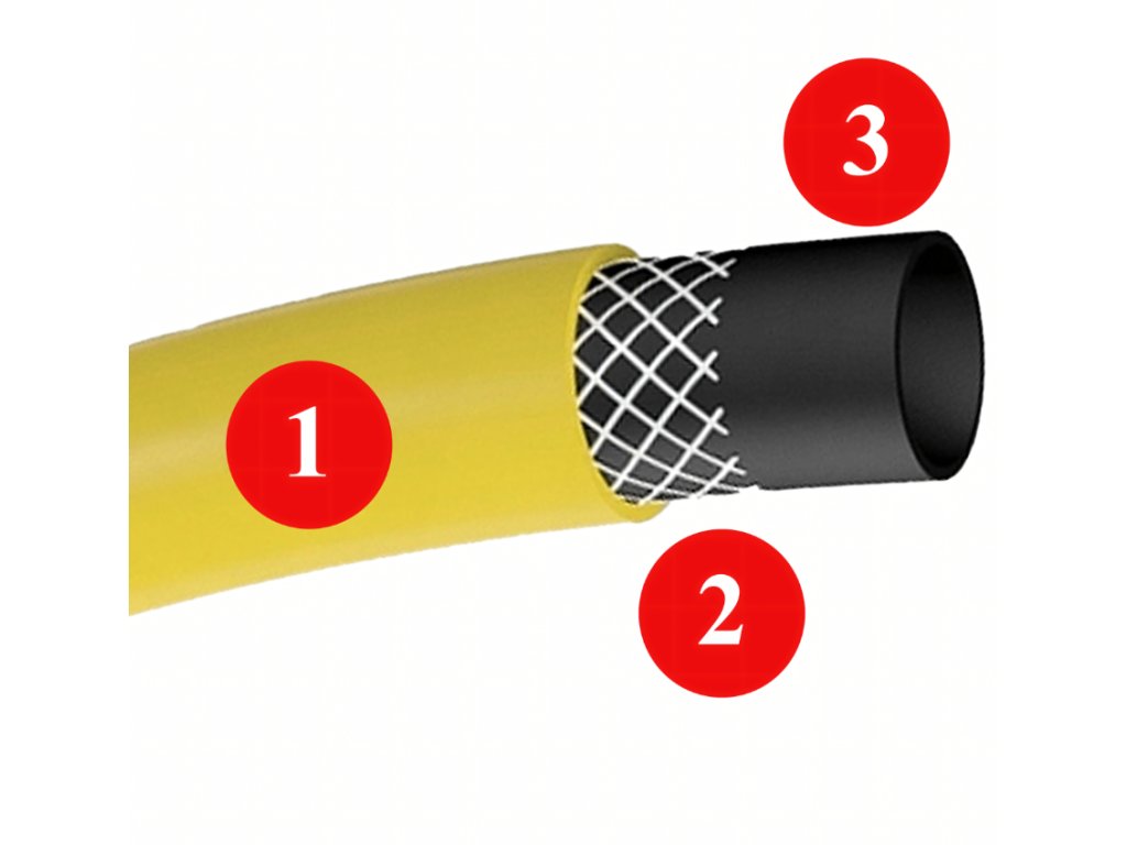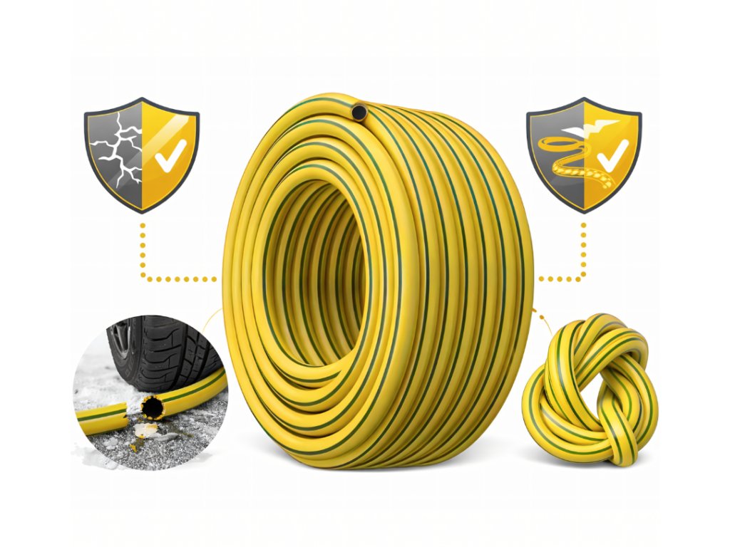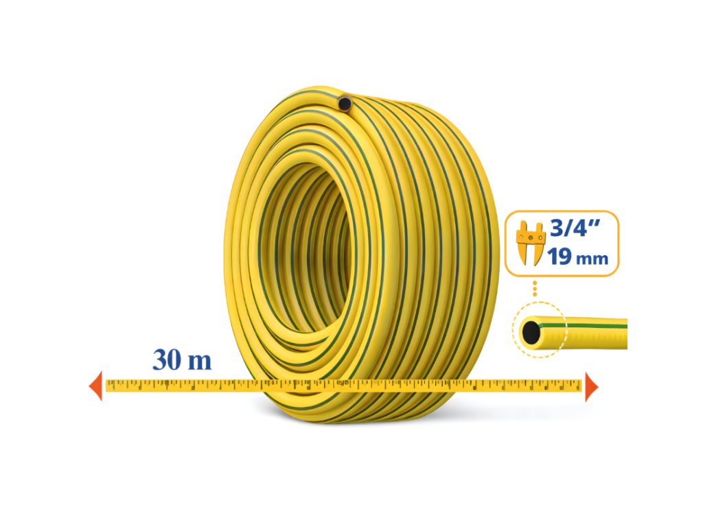 Záhradná hadica je odolná trojvrstvová hadica s dĺžkou 30 m určená na zavlažovanie záhrady aj ďalšie práce okolo domu. Vďaka priemeru 3/4" (19 mm) zabezpečuje dostatočný prietok vody a je vhodná pre bežné záhradné inštalácie. Konštrukcia z troch vrstiev PVC s výstužou zo syntetických vlákien zvyšuje pevnosť a odolnosť proti mechanickému poškodeniu. Hadica je zároveň odolná proti UV žiareniu, nekrúti sa a zabezpečuje plynulý prietok vody. Hladký vnútorný povrch zabraňuje usadzovaniu rias a uľahčuje údržbu.