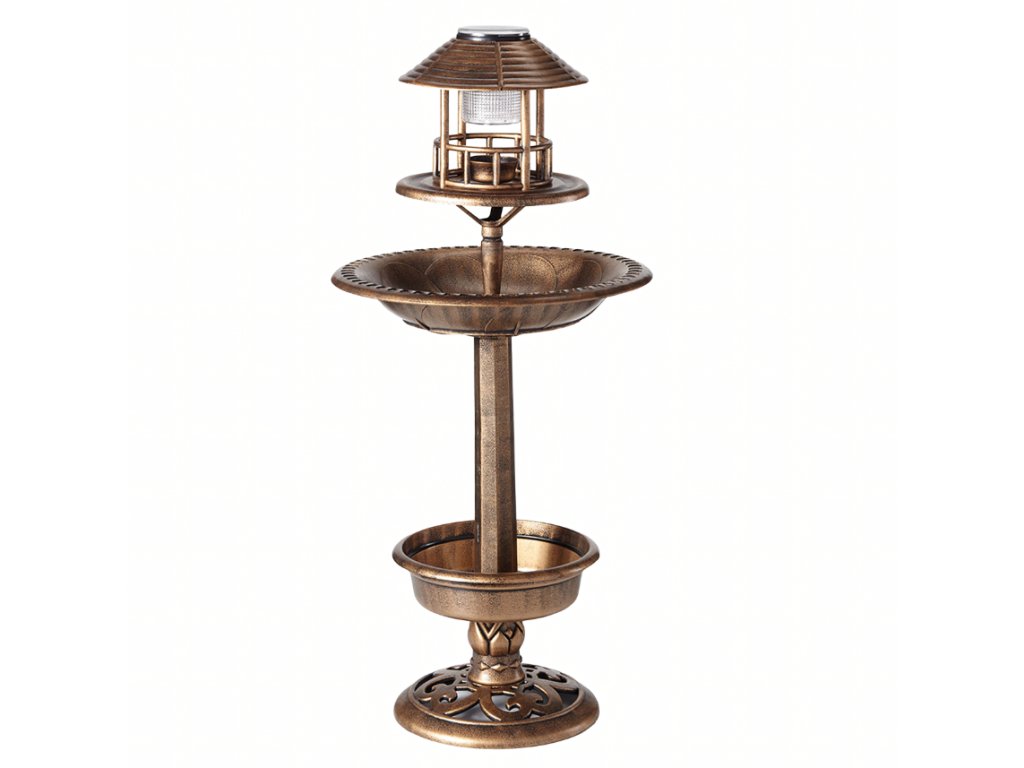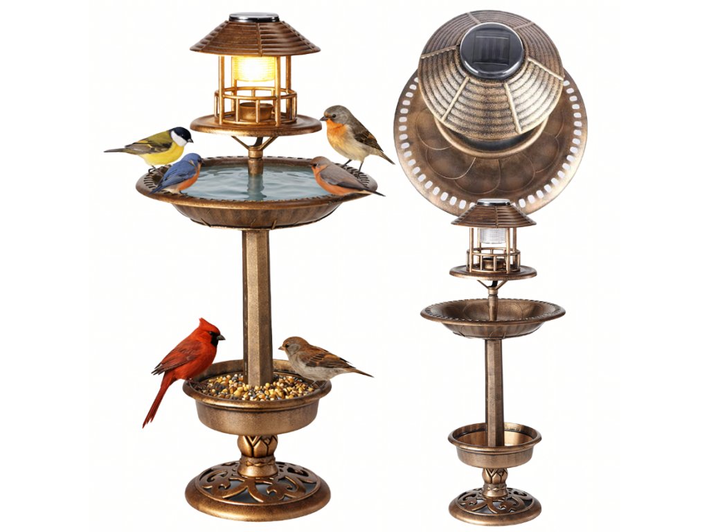 Záhradné LED kŕmidlo je dekoratívny a praktický doplnok do záhrady, ktorý kombinuje 4 funkcie v jednom zariadení – solárnu lampu, kŕmidlo pre vtáky, vtáčie kúpalisko a spodnú misku pre rastliny. Vďaka vstavanému solárnemu panelu a LED osvetleniu poskytuje príjemné atmosférické svetlo po zotmení bez potreby elektrického pripojenia. Konštrukcia z odolného plastu je navrhnutá pre vonkajšie použitie a odoláva dažďu aj mrazu. Elegantný retro dizajn sa hodí do každého typu záhrady a zároveň priláka vtáctvo, ktoré oživí okolitý prostredie.