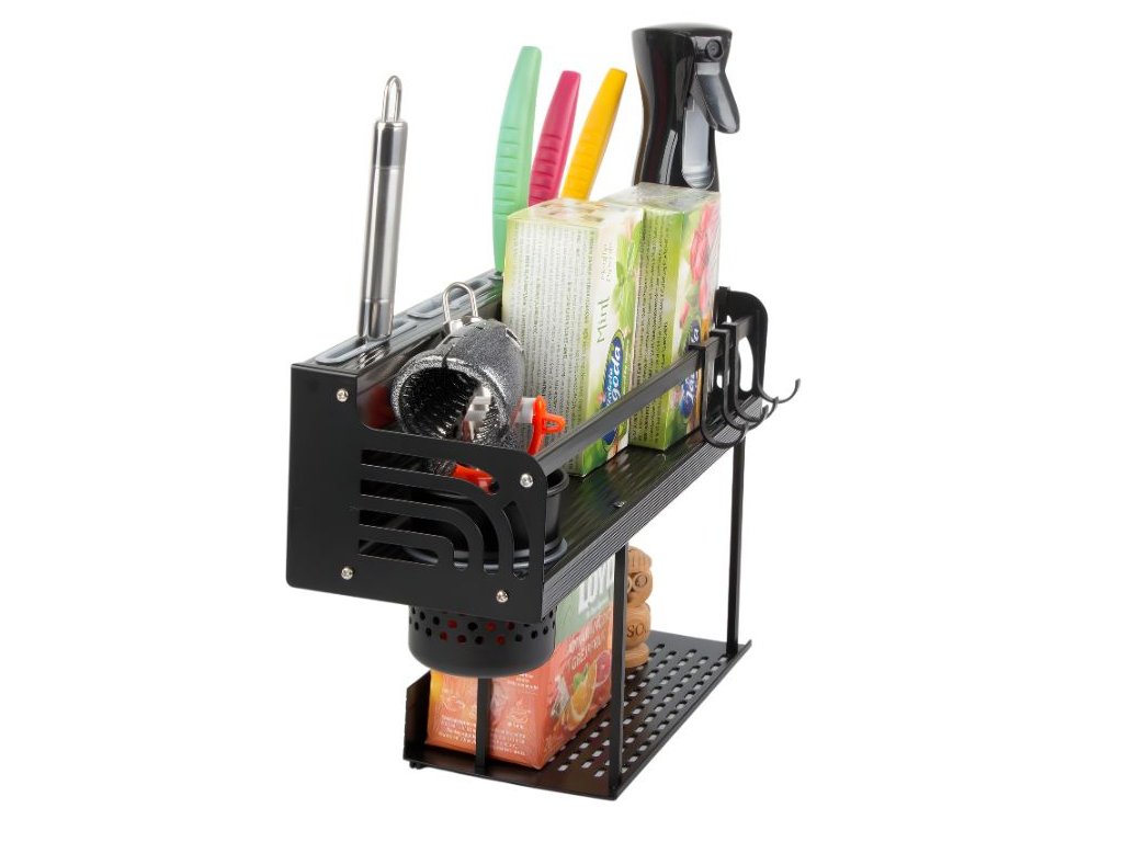 Robustná závesná polica slúži ako praktický kuchynský organizér, ktorý pomáha udržať poriadok a prehľadnosť v kuchyni aj kúpeľni. Vďaka premyslenej konštrukcii získajú koreniny, príbory, nože, hubky alebo čistiace prostriedky svoje pevné miesto a pracovná plocha zostane voľná. Moderný dizajn a čierne prevedenie sa ľahko zladí s väčšinou kuchynských interiérov.